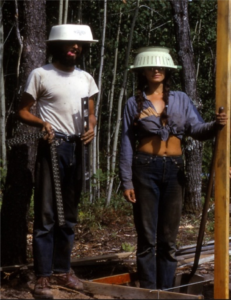 For the next decade, he devoted himself to his inner life and to help others – which led to a “back-to-the-land” stint of clearing land, growing vegetables, raising animals, hunting and building a common structure. The picture above was the “hard hat” crew (with a baking dish and colander on their heads) setting the foundation for a building.